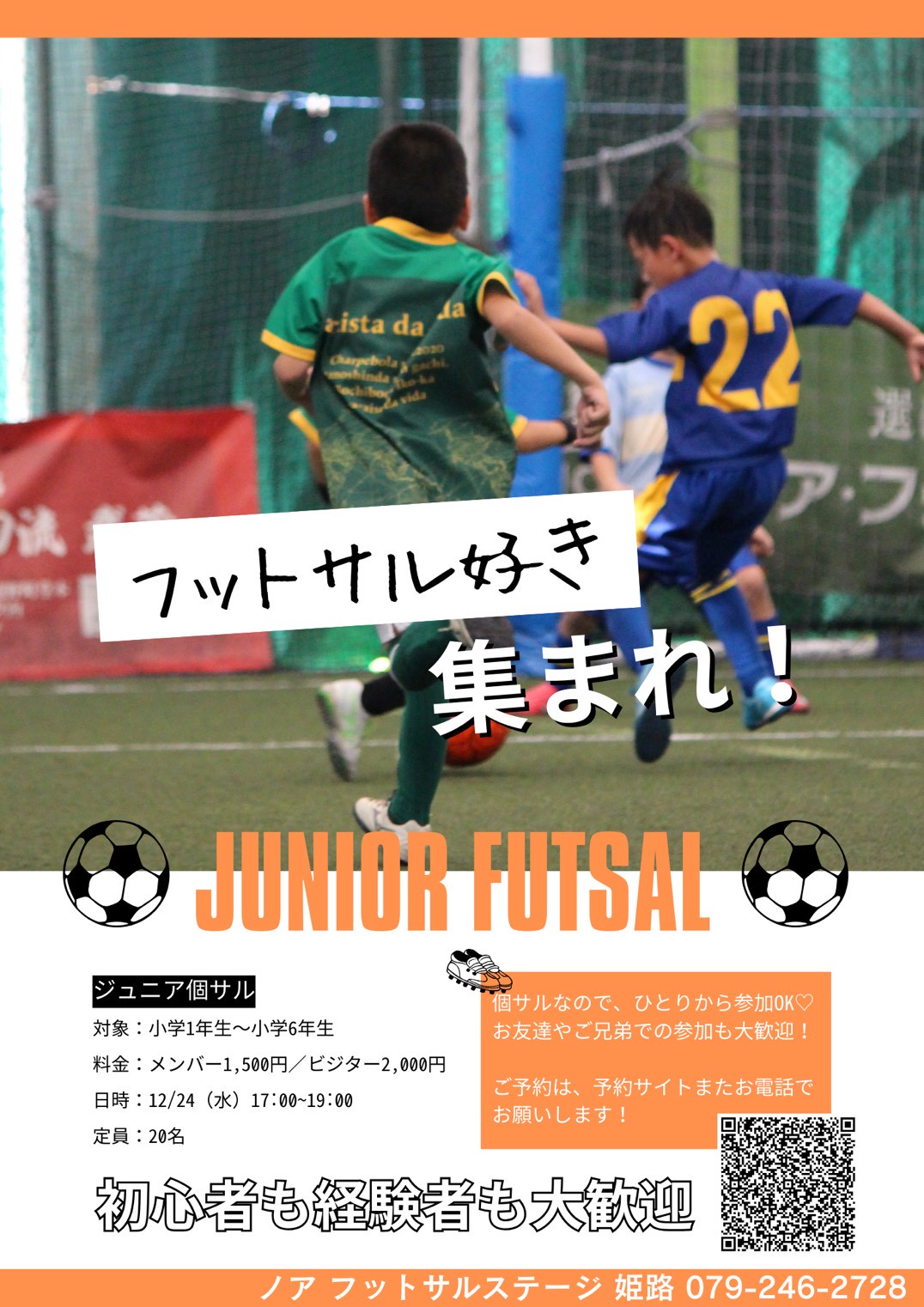 EVENT/NEWS 2025/11/26 EVENT/個人 ジュニアフットサル Checkジュニアフットサル@姫路12月24日(水)17:00~19:00 ジュニアフットサル 【フットサル好き集まれ!】 個サルなので一人から参加OK! お友達やご兄弟での参加も大歓迎です(^^♪ 初心者でも経験者でもご参加お待ちしております! 対象:小学1年生~小学6年生 料金:ビジター¥2.500/メンバー¥2.000 Check