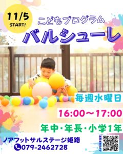 EVENT/NEWS 2025/11/3 EVENT/個人 Checkバルシューレ@姫路 11月5日(水)16:00-17:00 バルシューレ ボール活動を通して身体操作・思考力・挑戦する心を育みます。 こんなお子様におすすめ ・何のスポーツをするか悩んでいる ・運動が苦手 ・友達や兄弟で参加したい方 ぜひご参加お待ちしています。 Check