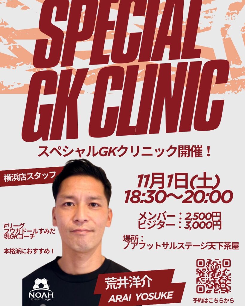 現フウガドールすみだ、そしてノアフットサルステージ横浜でも活躍する荒井洋介氏によるスペシャルGKクリニック!